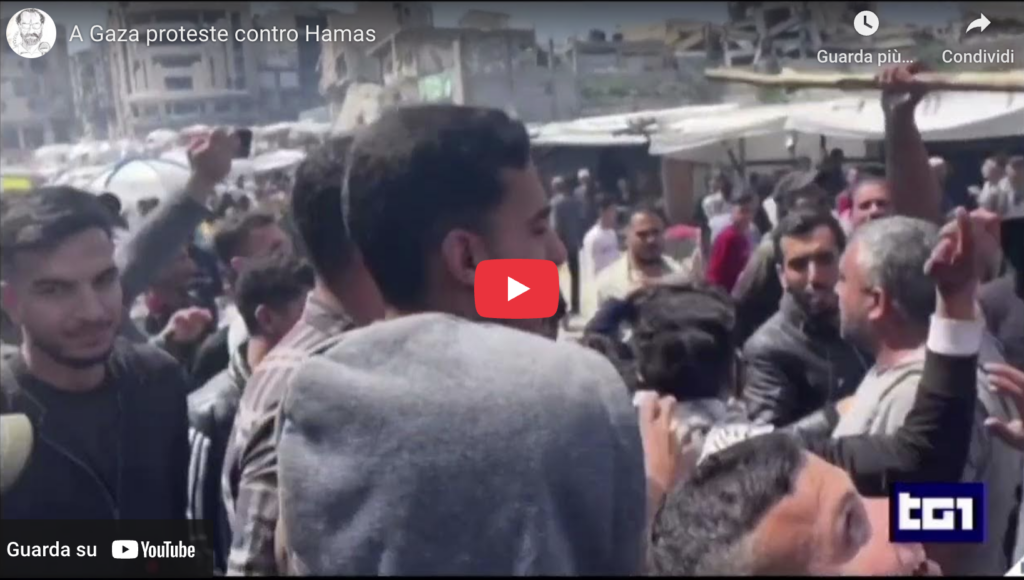 Tg1 ore 20 del 26 marzo 2025. GRIDANO “FUORI, FUORI HAMAS DA GAZA. HAMAS DEVE CADERE. NON VOGLIAMO LA GUERRA.” PER IL SECONDO GIORNO CONSECUTIVO MIGLIAIA DI PERSONE, ESASPERATE DALLA GUERRA, SCATENANO LA LORO RABBIA CONTRO HAMAS. MANIFESTAZIONI NEL NORD DELLA STRISCIA DI GAZA, A BEIT LAHIA, JABALIA, DEIR AL BALAH, MA ANCHE A SUD, […]