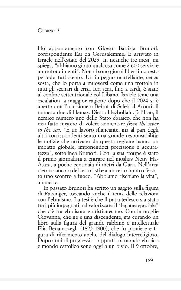 Ho appuntamento con Giovan Battista Brunori, corrispondente rai da Gerusalemme. È arrivato in Israele nell’estate del 2023. In neanche tre mesi, mi spiega, “abbiamo girato qualcosa come 2.600 servizi e approfondimenti”. Non ci sono giorni liberi in questo periodo turbolento. Un impegno martellante, senza sosta, che lo porta a muoversi come una trottola in tutti gli scenari di crisi. Ieri sera, fino a tardi, è stato al confine settentrionale col Libano. Israele teme una escalation, a maggior ragione dopo che il 2024 si è aperto con l’uccisione a Beirut di Saleh al-Arouri, il numero due di Hamas. Dietro Hezbollah c’è l’Iran, il nemico numero uno dello Stato ebraico, che non ha mai fatto mistero di volere annientare from the river to the sea. “È un lavoro sfiancante, ma al pari degli altri corrispondenti sento una grande responsabilità: le notizie che arrivano da questa regione hanno un impatto globale, imponendoci precisione e accura tezza”, sottolinea Brunori. Con la sua troupe è stato il primo giornalista a entrare nel moshav Netiv Ha Asara, a poche centinaia di metri da Gaza. Nell’area c’erano ancora dei terroristi e a un certo punto c’è sta to uno scontro a fuoco. “Abbiamo rischiato la vita”, ammette. In passato Brunori ha scritto un saggio sulla figura di Ratzinger, toccando anche il tema delle relazioni con l’ebraismo. La tesi è che il papa tedesco sia stato tra i più impegnati nel valorizzare il “legame speciale” che c’è tra ebraismo e cristianesimo. Con la moglie Giovanna, che ne è una discendente, sta curando un libro sulla figura del grande rabbino e intellettuale elia Benamozegh (1823-1900), che fu pioniere e figura di riferimento anche del dialogo interreligioso. Dopo anni di progressi, i rapporti tra mondo ebraico e mondo cattolico sono oggi a un bivio.